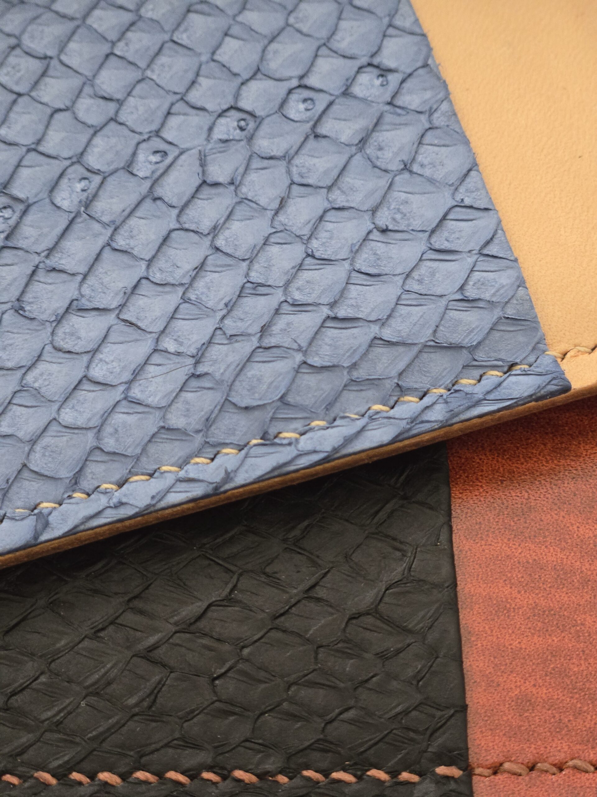 Nos porte-cartes intègrent également un insert en cuir marin (saumon), tanné en France. Cette matière rare, fine et résistante confère à chaque pièce une texture écailleuse singulière.